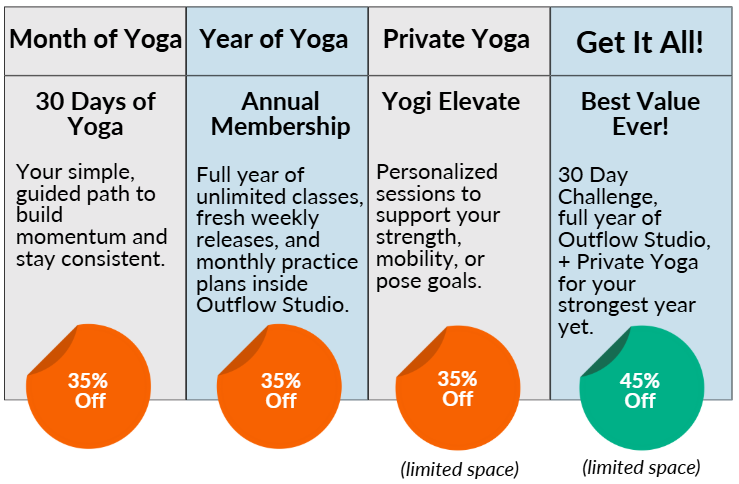 Start with the 30 Days of Yoga Challenge, extend that for a full year membership inside the Outflow Studio, and 3 private yoga sessions to help you progress faster with personalized support.