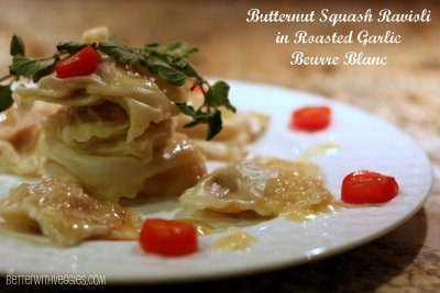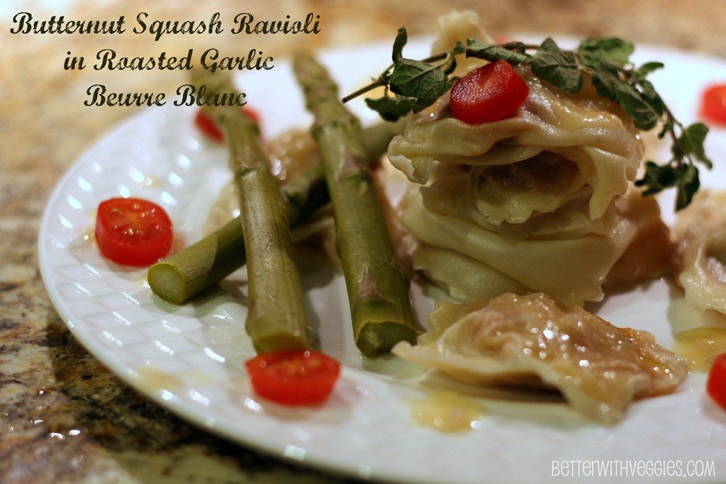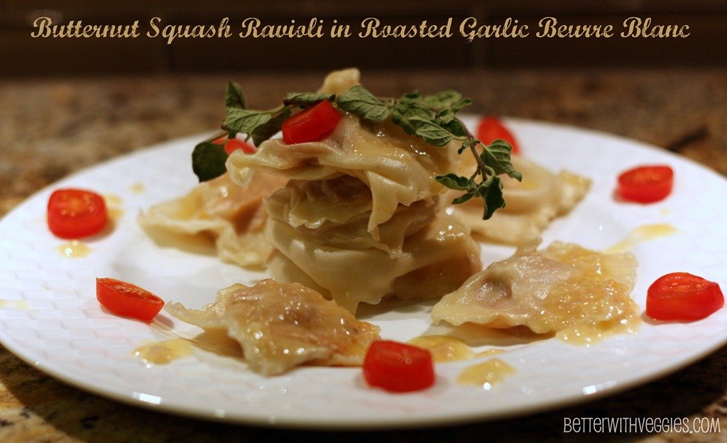 Last week, we covered the recipes for the amuse bouche and appetizer that Kirk and I created for our Fall Pairing Dinner. This week, it’s time to share the entrée and dessert from that delicious date night meal. Let’s start with the entrée that Kirk created first – Butternut Squash Ravioli in Roasted Garlic Beurre Blanc!