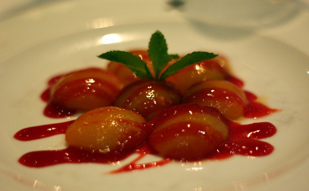 And a few interesting desserts, including: warm plums with raspberry sauce and an eggless custard.