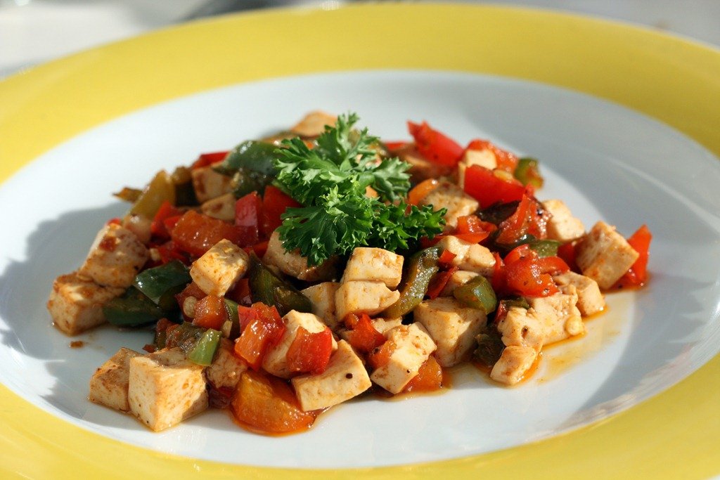 About 30 minutes later, this delicious plate of tofu scramble (tofu chopped?) was delivered to our table…and it was delicious!!