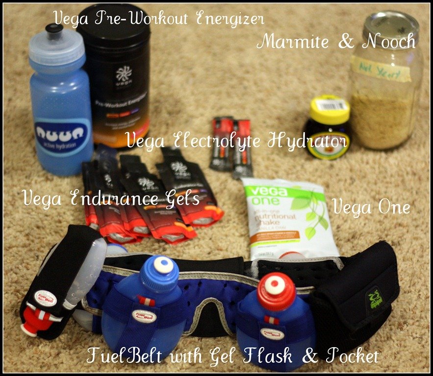 - During the race, I like to eat a Vega Endurance Gel every 4.5 miles. I’ll squeeze those gels into the gel flask (attached to my FuelBelt) to make carrying 5 gels worth of nutrition easy.