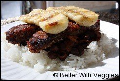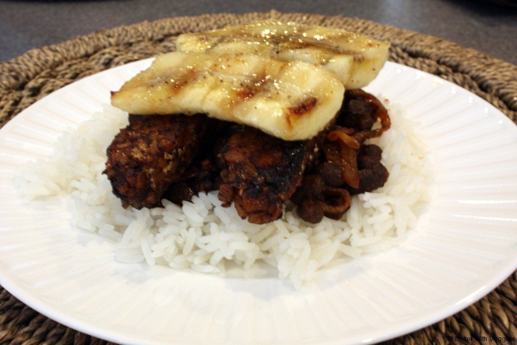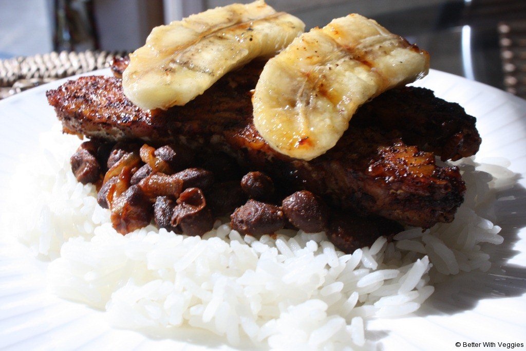 - Add 1/2 cup cooked rice and 1/2 cup black bean mixture to plate. Top with 2 prepared tempeh slices and two slices bananas.