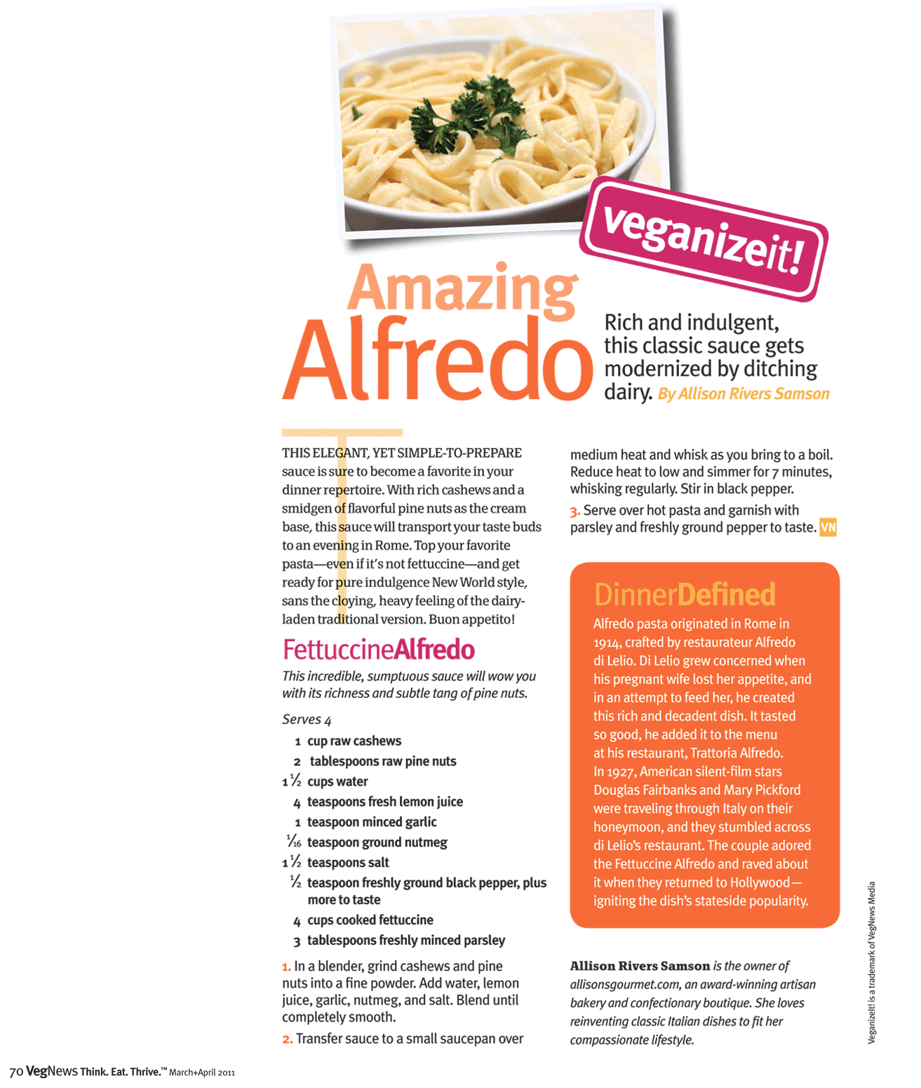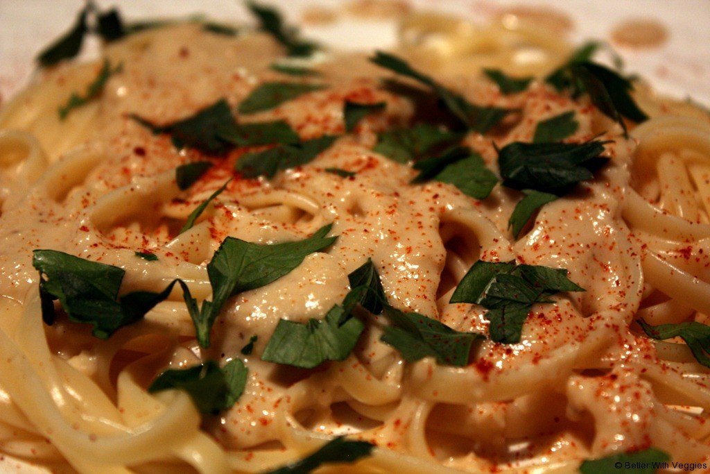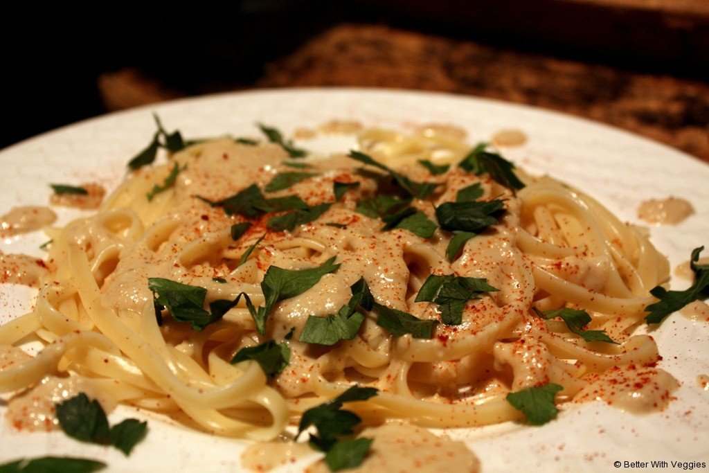 Now for the main event: Fettuccine Alfredo, created by Allison Rivers Samson and originally published in her VegNews Magazine column, “VeganizeIt!”. In our case, the pasta is actually linguine, as that’s what we had in the pantry. We enjoyed our dinner on the back porch, with the fire crackling in the outdoor fireplace (okay…firepit).