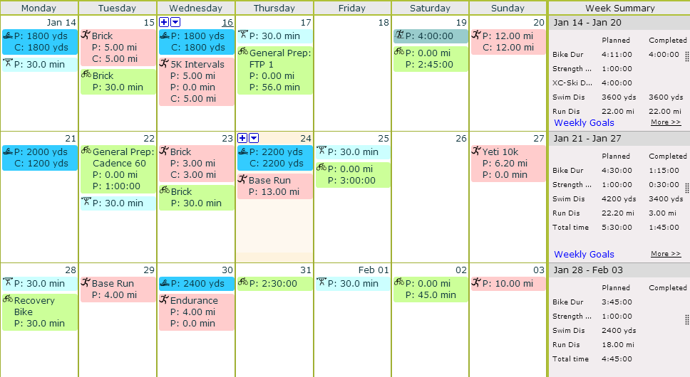- TrainingPeaks: This is the software I use with all my athletes and for my own running/triathlon training. There’s a free version for personal use and the calendar is an easy-to-use drag & drop tool. It also has capabilities to upload from your devices – Garmin, PowerTap, etc. Plus, there’s an mobile app for tracking on the go!