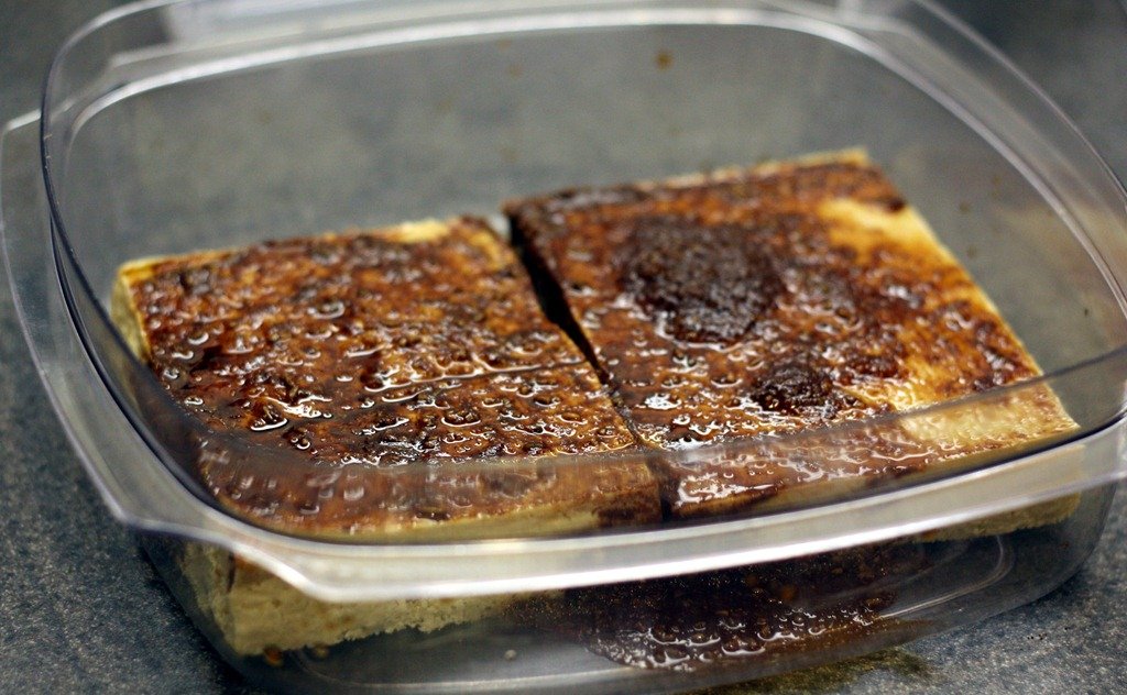 Cut the tofu in half lengthwise and place in a shallow dish (I used Tupperware). Pour half whiskey mixture over the top of the tofu and rub in to coat. Flip tofu and pour remaining whiskey mixture over tofu and rub in. Coat all sides of tofu with extra marinade in the dish. Allow to sit for at least 30 minutes, preferably an hour.