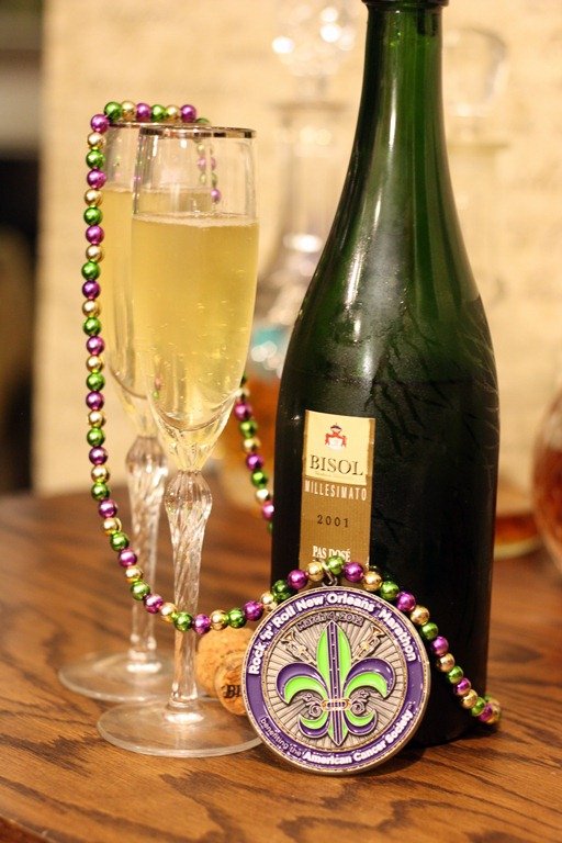 Before the marathon last weekend, Kirk and I picked out a celebratory wine that we would open only after I broke the 4 hour barrier. If I didn’t make it this race, that bottle would remain unopened until I did (talk about motivation!). We chose a 2001 Pas Dose’ Extra Brut from Bisol – a sparkling wine from the Prosecco region of Italy, but  made using the traditional Champagne method. This is a bottle we got at the winery during a trip a few years ago, which makes it even more special!