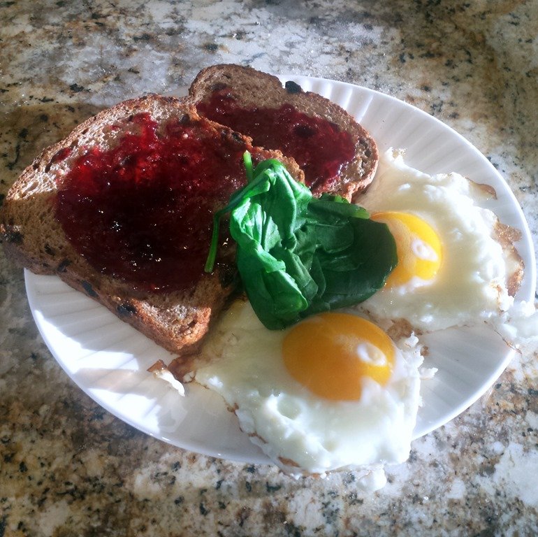 Meal 1: My favorite breakfast – fried eggs, toast, and spinach.