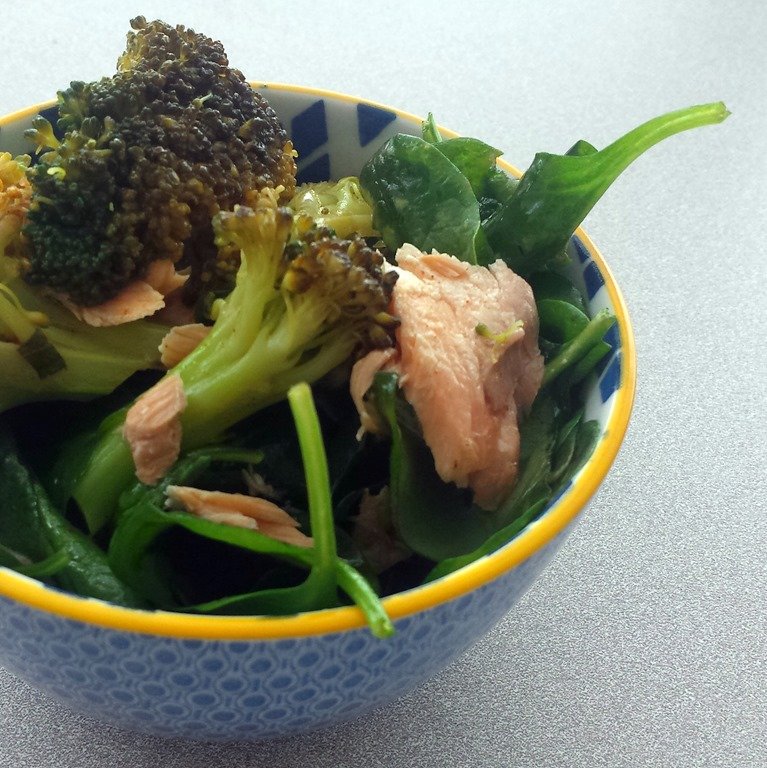 A tasty way to enjoy a LOT of veggies and a healthy mix of protein. Tooped with a homemade lemon vinaigrette, this spinach salad with broccoli is topped with my new favorite Honey Smoked Salmon – the Chipotle Lime flavor goes really well with the other bright flavors!